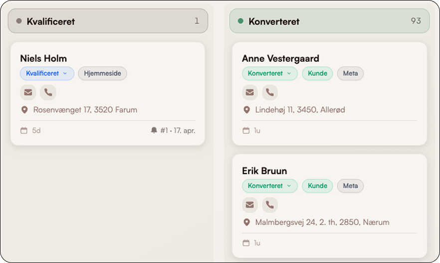 Hent leads fra Facebook, CVR-registeret eller via formularer. AI-maillæseren opretter automatisk nye leads fra indgående henvendelser — og sætter straks opfølgning i gang.